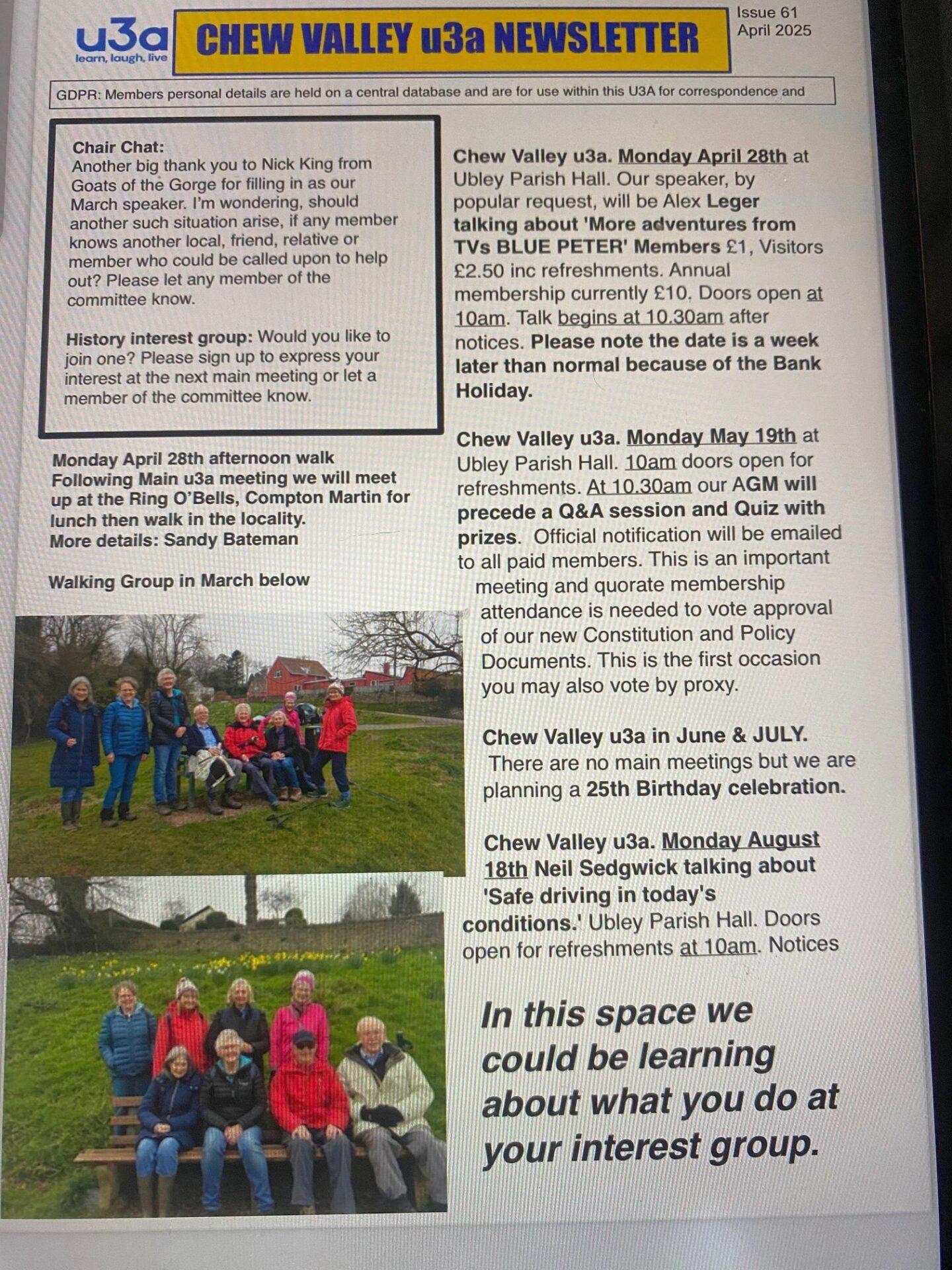 The Chew Valley u3a serves a group of villages from Blagdon in the west to Pensford in the East and the surrounding area. It has been running successfully for 25 years. We offer a varied array of groups along with monthly talks at Ubley Parish Hall, which has plenty of parking.